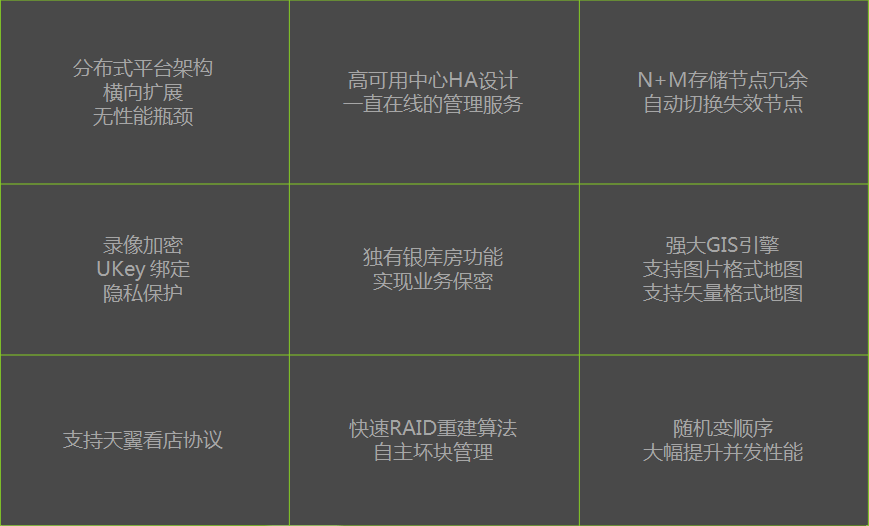 多廠商前端設(shè)備支持 智能轉(zhuǎn)發(fā) 高性能解碼 統(tǒng)一身份認證,完善的權(quán)限設(shè)置 支持GB28181 支持報警主機、門禁、視頻分析、數(shù)據(jù)采集、應(yīng)用監(jiān)控